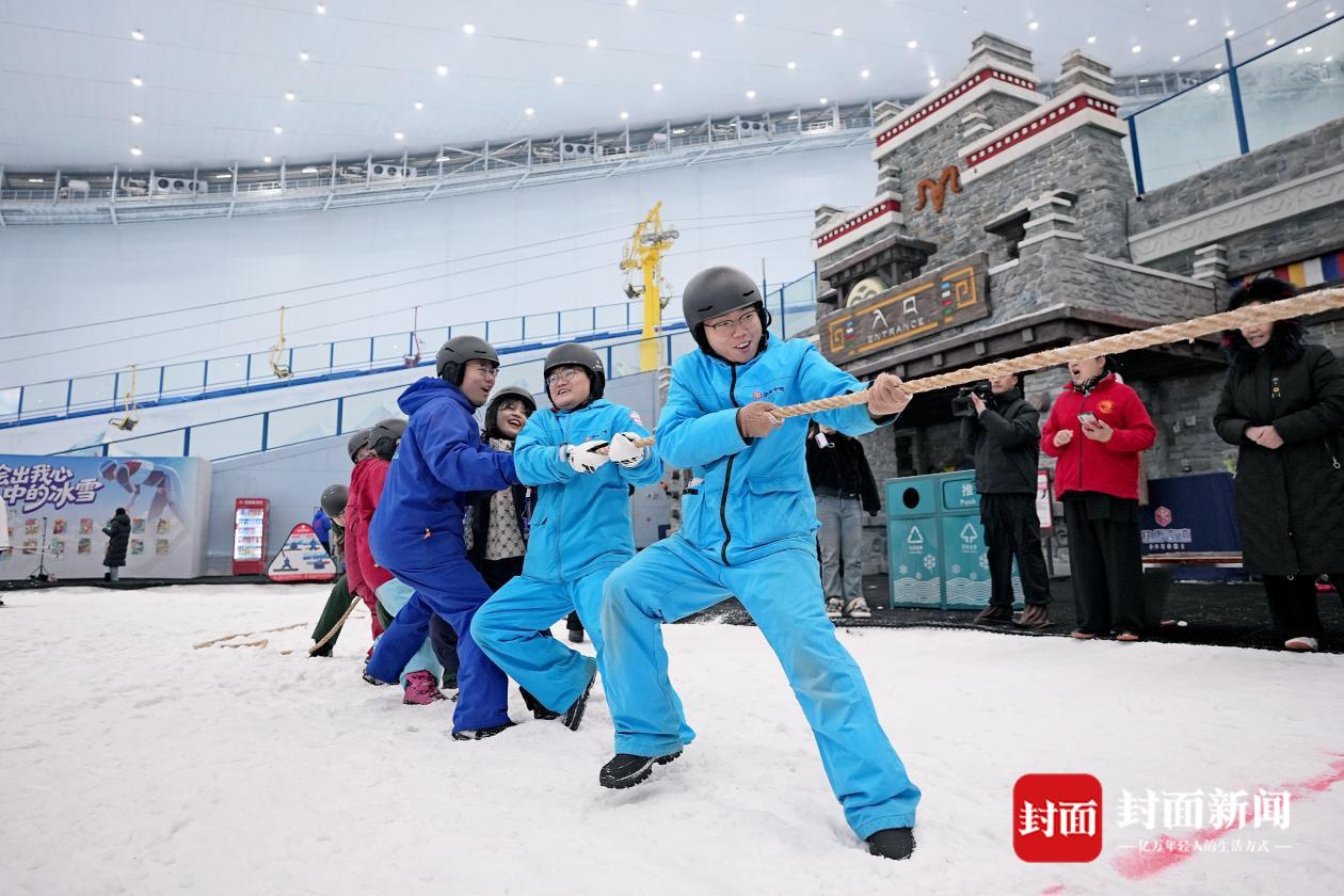 启动仪式结束后,雪地拔河、雪合战、雪地精准投壶、欢乐套圈等一系列趣味冰雪项目同步开启,专业的自由滑雪体验与全民冰雪公开课也有序推进。在雪地赛场,队员们齐心协力、奋勇争先,冰雪的寒凉丝毫阻挡不了大家的运动热情;在滑雪道上,初学者在专业教练的指导下小心翼翼地探索,感受速度与平衡的乐趣,欢声笑语洒满整个场馆。