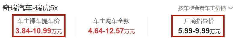 以瑞虎5x为例,该车售价5.99-9.99万元,车主提车价为3.84万元起,相当于标配车型优惠了2.15元,当然,这个优惠里面可能包含了报废补贴或置换补贴。